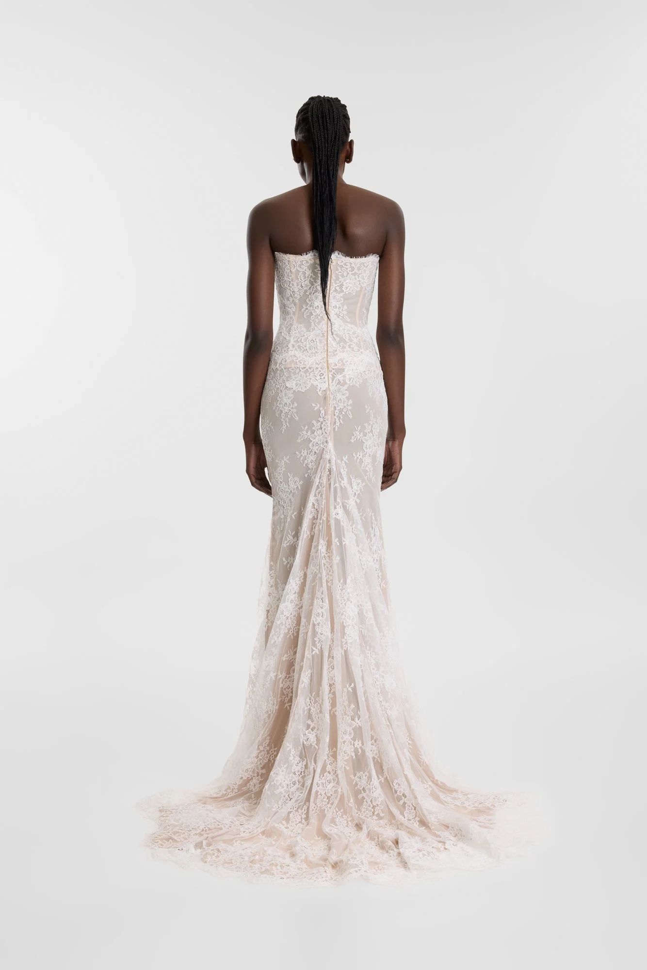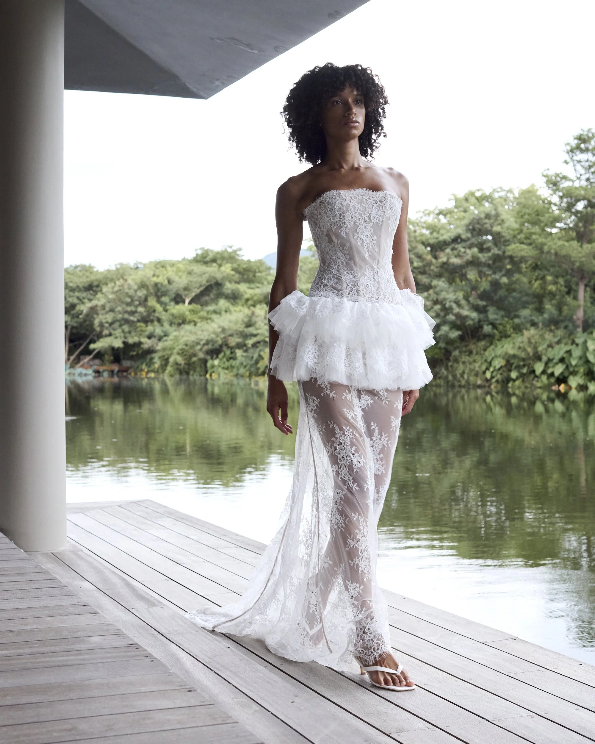 Lace reinvention thanks to a 90s make-under in KYHA Bride Gibson. Designed for minimalists chasing lace with restraint, Gibson delivers thanks to its pared-back silhouette - a structured, strapless corset and fit and flare skirt. Sheer hand-moulded lace embroidery over a nude base creates contrast, delivering a fresh take on sleek romance.