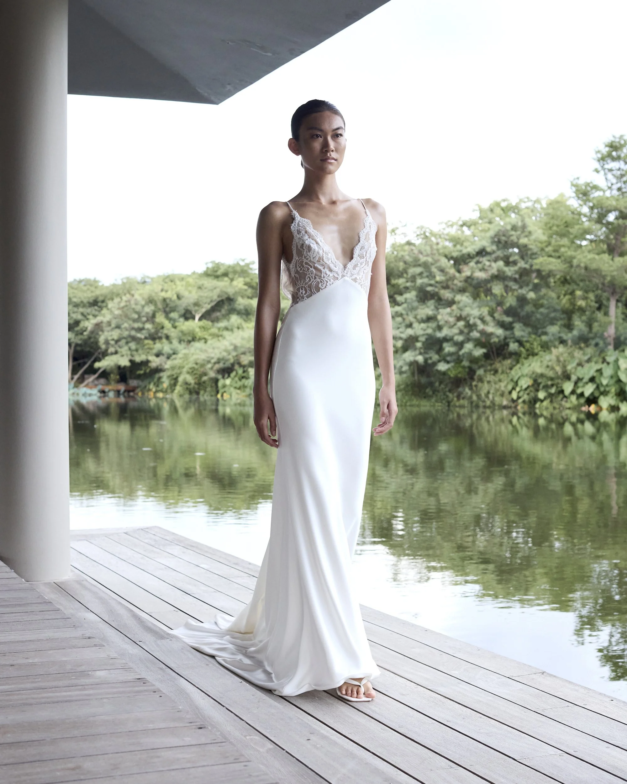 A moment of sheer delight in Kyha Bride Azolla. Cut on the bias from fluid double satin that skims the body, Azolla features chiffon-lined lace panels, creating a sheer effect. The neckline plunges to a deep V, balancing delicacy with precision. Barely-there straps frame the shoulders, whilst the clean fit and flare skirt falls into a soft train: minimalist lines that amplify the drama of diaphaneity.