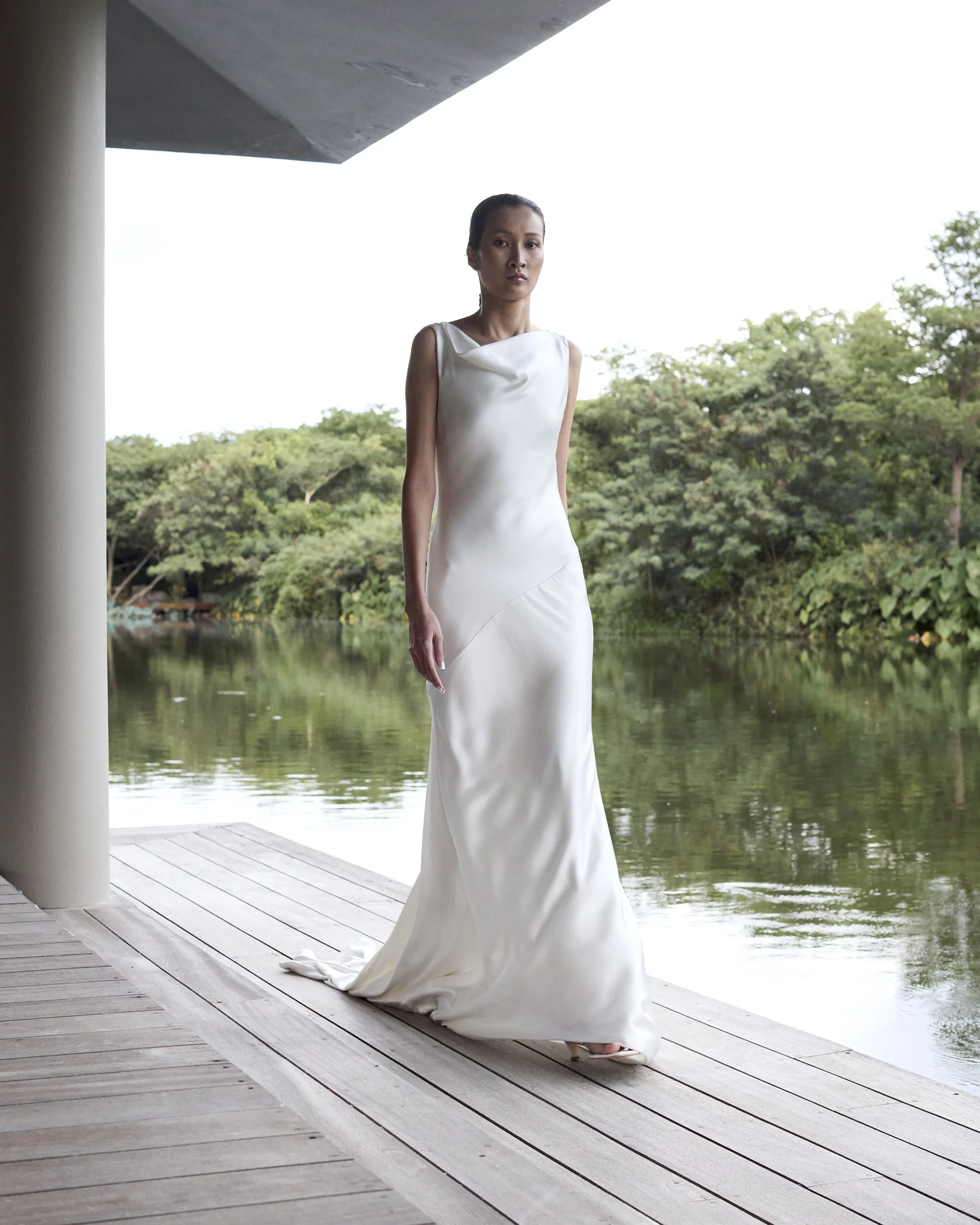 A conceal-reveal sartorial statement at the core of your look in KYHA Bride Mica. Bias-cut, a high neck drape detail keeps 90s elevation high, but you'll keep doubling back to the star of the show, a drape-detailed open back.