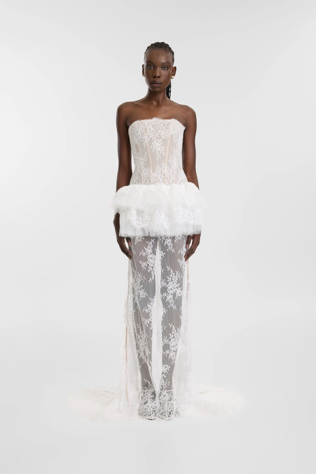 Diaphanous dressing in KYHA Bride Wilton. Constructed by hand-moulding delicate lace, Wilton sees swathes of sheer lace contrast a nude chiffon base for a study in understated impact. A highly structured, corseted bodice boasts a scalloped edge along the neckline, which continues around the hemline and train. Artful lace placement at the back of the skirt creates a paradigm-bending semi-column skirt at the front and full skirt and train at the back.