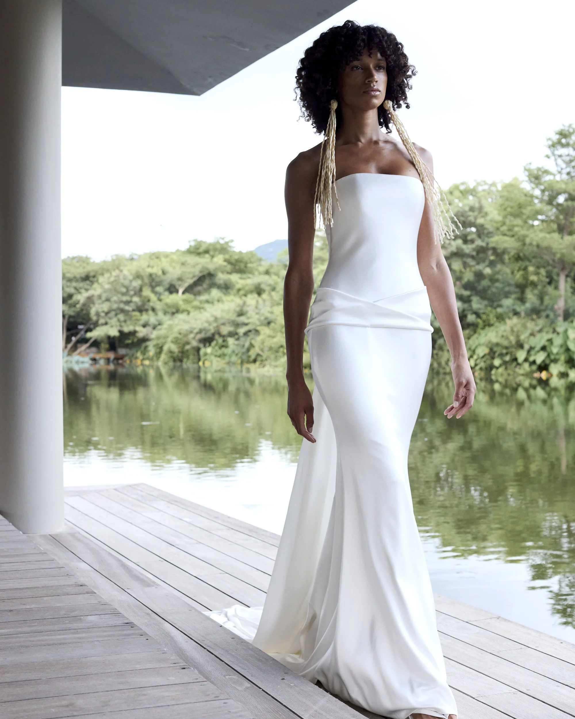Meet your perfect match in KYHA Bride Raina. A strapless column front with side split transitions into a dramatic train at the back. Featuring a floral-inspired sweetheart neckline, organic asymmetrical draping wraps the bodice and cascades through the skirt. Minimal yet textured, Raina will see you master the art of fluid drapery.