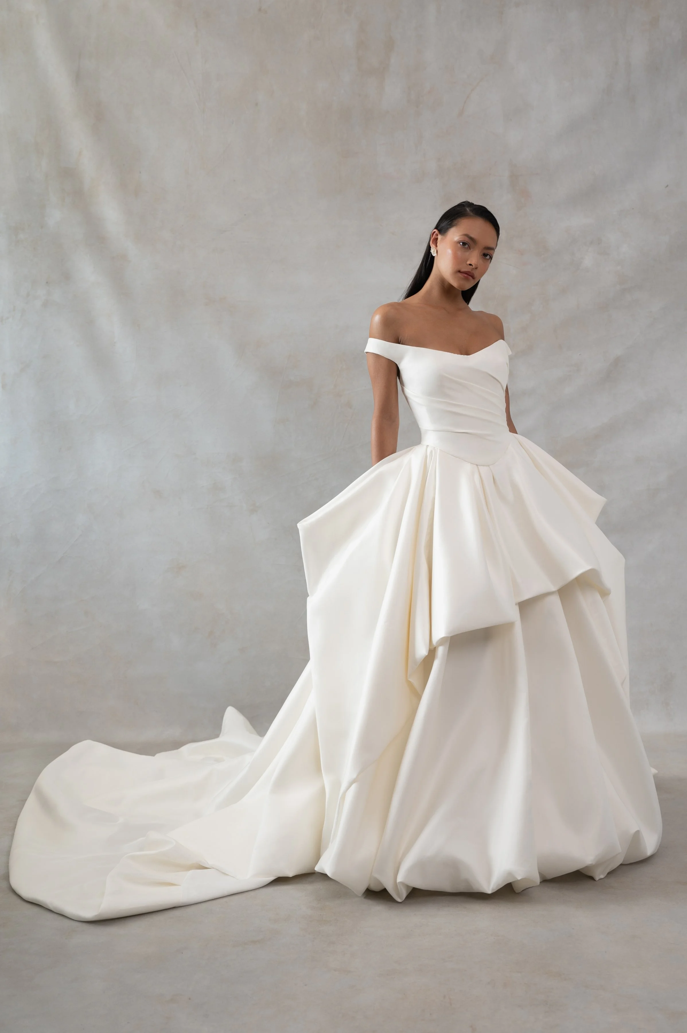 The Jenny Yoo Elle gown stocked at Halo & Wren Bridal - The Elle gown, cut in our lofty Italian taffeta, is a true chameleon. Featuring a corseted bodice with a flattering Basque waist and a delicate off the shoulder strap, her voluminous skirt transforms into a dramatic high-low look perfect for dancing.